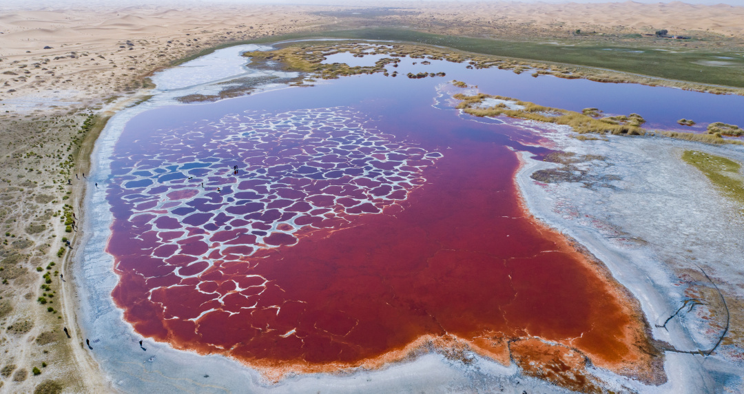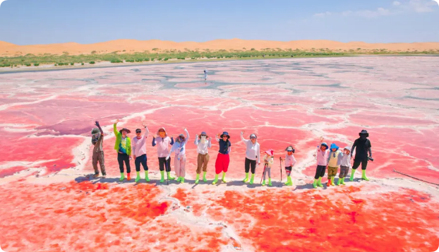 今日途径2024年度西北地区最火爆网红打卡点【地球心脏-乌兰湖】,在腾格里沙漠深处的无人之境,有一颗鲜红的,正在跳动的“地球之心”,这里没有人烟,也没有信号,这是一片炙热的红色湖泊,在地球上沸腾,就像是地球跳动的脉搏。你在地图上也找不到它的位置,所以请记住它的名字—乌兰湖。走在湖边,就像行走在一盘巨大的粉色调色板上,如果不亲眼所见,你绝对不会相信这些现切的雪花牛肉和灌满石榴汁的湖泊是真实存在的。