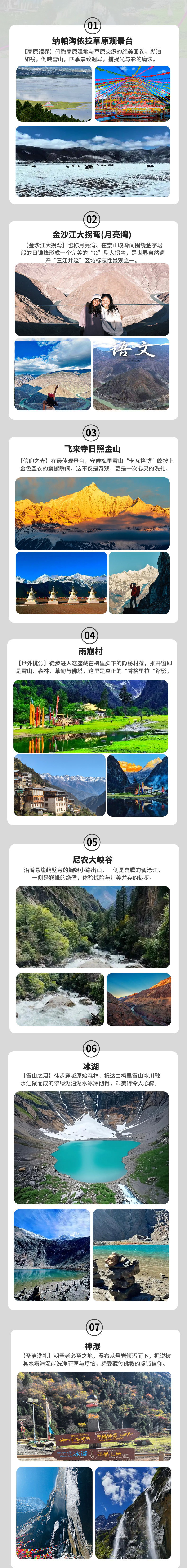 清晨8点丽江早出发,途径风吹草地见牛羊的小中甸,继续前往香格里拉,到达纳帕海,我们将在观景台处俯瞰美景,这里一年中半年是草原,半年是海子。中午到达奔子栏,自行享用午餐,午餐后抵达金沙江月亮湾,金沙江遭遇了一座浑圆的金字塔型山峰,金色的江水于是绕着山峰流出了一个标准的“Ω”形。随后翻越白马雪山,欣赏白马雪山美景后,大约17点左右到达飞来寺,入住飞来寺雪山观景酒店,结束这一天的行程。