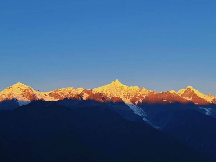 清晨7:30左右前往飞来寺,天气允许情况下观日照金山,这里是梅里雪山最佳观景台之一,这里视线低,几乎没有遮挡,距离雪山的距离也很近,在这里观景有种雪山扑面而来的震撼,梅里十三峰像是千簇万簇蓄势待发的利箭,巍峨傲然,气势非凡。后沿着金沙江河床,乘车1小时左右,来到徒步的起点尼农村,这里雪山脚下的原始森林和大峡谷,雨崩流出的神瀑河溪水一路向下,穿越整个尼农大峡谷,沿途的风景如画,令人目不暇接,徒步大约5小时左右到达下雨崩,然后继续前往上雨崩,到达酒店办理入住,结束我们一天的行程。
