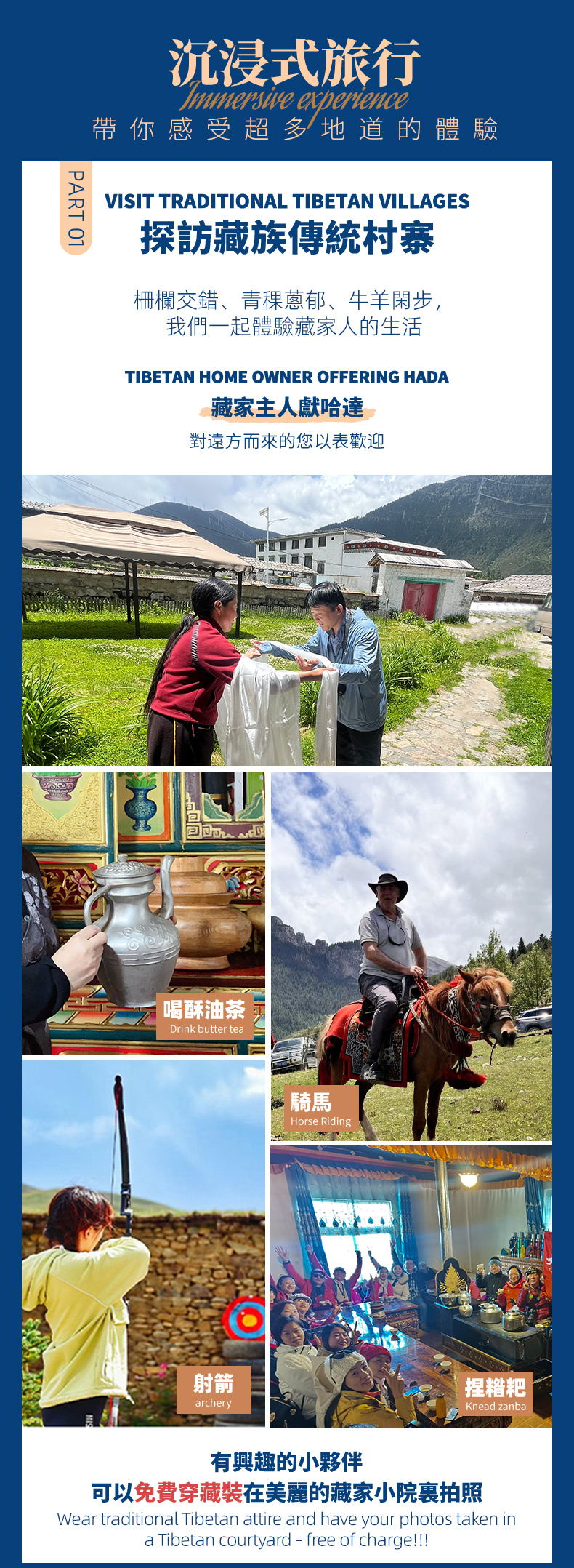 【行程概述】早餐後乘車離開雅江,沿途觀賞【天路十八彎】的險峻,穿越【剪子彎隧道】,隨後翻越【卡子拉山】(埡口海拔4718米),抵達【丁真的家鄉】--理塘,這裏風景絕美,六世達賴喇嘛倉央嘉措曾在詩裏寫下自己對理塘的嚮往:“潔白的仙鶴啊,請把你的翅膀借給我,我不會飛到很遠的地方,我到理塘轉轉就回......‘’我們將在理塘遊覽《丁真的世界》宣傳片裏出現的【勒通古鎮·千戶藏寨】,這是全世界規模最大的傳統藏寨群落,有超過4000棟的傳統藏房,是探尋藏文化和康巴風情的不二之選。在這裏,我們可以隨著景區講解員的講解依次遊覽:【318記憶微博物館】、【康巴人微博物館】、【仁康古屋(先後降生過十三位德高望重的大活佛)】、【倉央嘉措微博物館】,幸運的小夥伴還可以偶遇丁真。隨後參觀康區歷史最悠久、規模最大的藏傳佛教黃教寺廟--【長青春科爾寺】,聆聽它的傳奇故事。遊覽後繼續前行,經無量河,翻越形似兔子的【兔兒山】(埡口海拔4696米),途經青藏高原最大的古冰川遺址、稻城古冰帽——【海子山】自然保護區(海拔4500米),一邊聆聽著車內的音樂,一邊欣賞著【毛埡大草原】的風光,每年6-8月份,是最美麗的時節,一望無邊的草原上野花盛開,無數牛羊散落其間,邦錦美朵、格桑花以及各種不知名的小花璀璨盛開,就是一個花的世界。而後途徑海子山上的【姊妹湖】,兩處碧藍澄澈的的高原湖泊緊緊相依,在一呼一吸之間,散發著讓人沉醉的恬美,在荒涼山原上,如天堂寶石般鑲嵌其中,亦如神之悲憫化作眼淚滴落凡間,純淨無暇,盈盈可親。一路邊走邊玩,車子很快就到了四川的邊界巴塘。