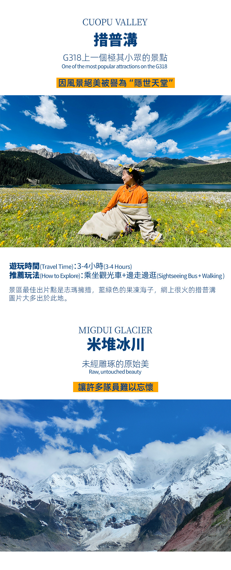 【行程概述】早餐後前往世界的【措普溝】——G318最美遇見,這裏濃縮了高原的美景,雪山、草原、森林、湖泊、寺廟皆有。隨後在遊客中心換乘景區觀光車,首先我們會經過【亞索寺】,它屬於藏傳佛教中的寧瑪派寺院,在深山綠水間,紅色的建築格外亮眼;接著來到【熱坑溫泉群】,這裏是享有四川地熱資源之冠美譽的茶洛熱坑溫泉群,在長約1.5公里,寬約300米的範圍內,集中分佈了150餘個氣熱泉和熱噴泉口,溫度高達85℃以上,因此10分鐘左右就可以享用美味的溫泉煮雞蛋;下一站便是【章德草原】,曾被《中國國家地理雜誌》譽為川西最美的高寒草原,極目所至,遠處便是雄偉的紮金甲博神山;隨後來到康巴第一聖湖——【措普湖】,湖面波光粼粼,夏天湖邊開滿五顏六色的野花,定會讓你流連忘返;最後打卡【措普寺】、【康珠拉措】和【志瑪擁措】,這對如綠松石般翠綠的姊妹湖您一定不要錯過,她們倆可是措普溝的顏值擔當。在景區遊玩期間,如果您有幸運的話,還能遇見可愛的土撥鼠,與它們親密互動,感受感受人與自然的高度和諧。出景區後經竹巴籠,過金沙江大橋,進入西藏界,就抵達了今晚的目的地芒康。
