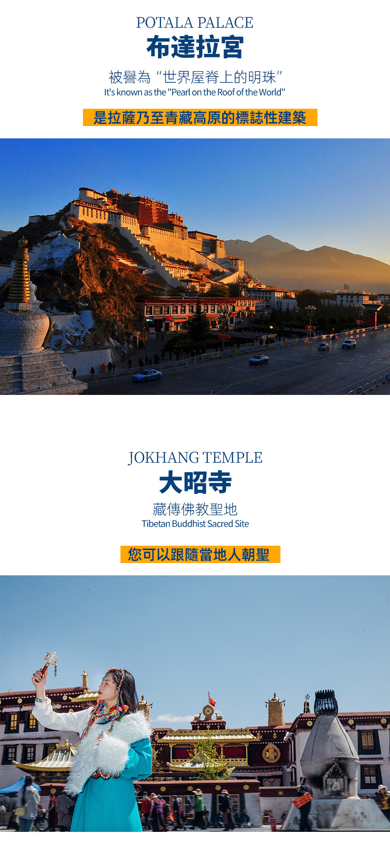 【行程概述】早餐後適時前往【布達拉宮】參觀,布達拉宮坐落於拉薩市區西北瑪布日山上,是世界上海拔最高,集宮殿、城堡和寺院於一體的宏偉建築,也是西藏最龐大、最完整的古代宮堡建築群。布宮依山壘築,共13層,高117.19米,東西長400餘米,現在我們看到的布達拉宮分兩部分:白宮和紅宮。而後前往【大昭寺】,大昭寺位於拉薩市老城區的中心,距今已有1350年的歷史,它是西藏現存最輝煌的吐蕃時期的建築,始建於西元647年,它有5座金頂,108個佛殿。藏族人民有“先有大昭寺,後有拉薩城”之說,大昭寺在拉薩市具有中心地位,不僅是地理位置上的,也是社會生活層面的。環大昭寺內中心的釋迦牟尼佛殿一圈稱為“囊廓”,環大昭寺外牆一圈稱為“八廓”,大昭寺外輻射出的街道叫【八廓街】即八角街。以大昭寺為中心,將布達拉宮、藥王山、小昭寺包括進來的一大圈稱為“林廓”。這從內到外的三個環型,便是藏族同胞們行轉經儀式的路線。