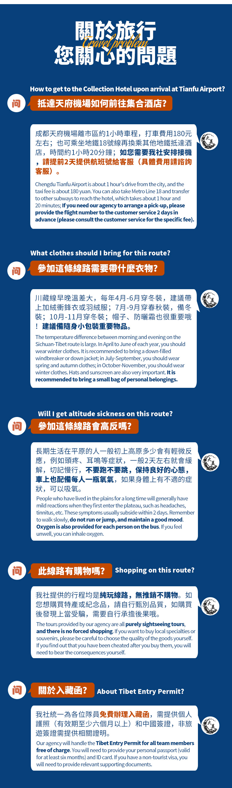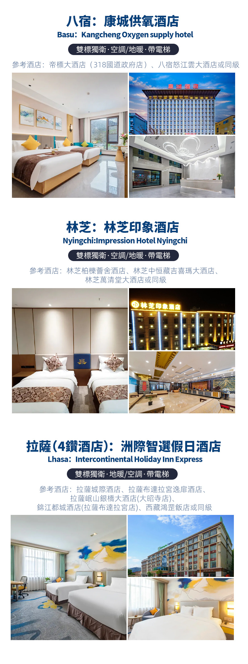(2)到集合酒店報“大美G318+姓名”拿房,房費已付,押金自付。入住酒店的時間一般在集合日當天的14點以後,如果您提前到達且酒店房間未整理出來無法辦理入住,可將行李暫時寄存在前臺,先在市區周邊自由遊玩;