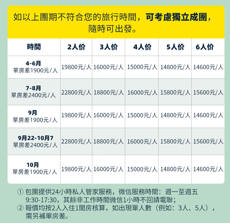 (4)對於住宿有特殊要求的隊員,請在報名時告知客服(要求全程一個人住宿,大床房,三人間等等),在報名時確定費用,上團後臨時修改住宿,可能無法滿足其要求;