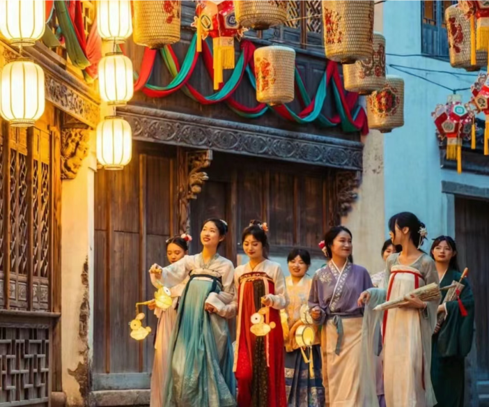 古街上,轻纱悬挂,红色灯笼点缀着古朴的青瓦屋檐,明清小镇的风韵跃然眼前。橘井药坊、嘉禾倒缸酒坊、玲珑茶坊、金贵银坊等郴州“老字号”齐聚瓦窑坪