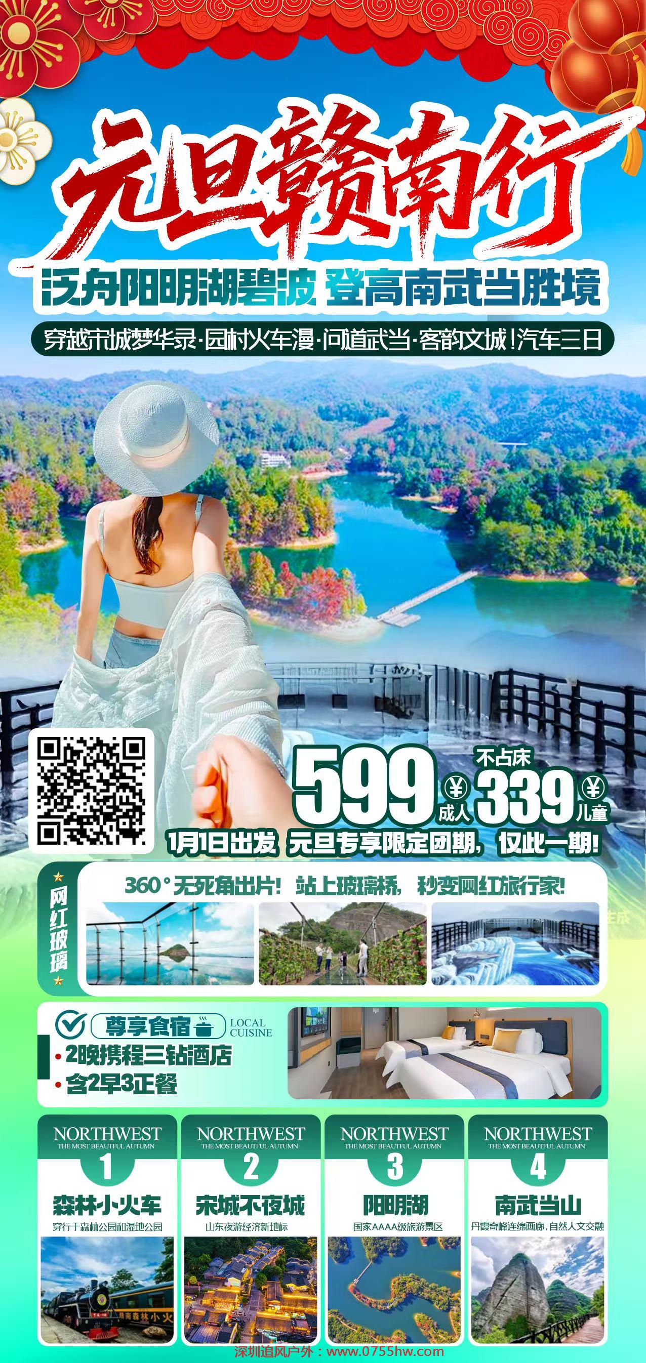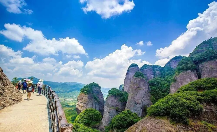 酒店早餐后, 游览【南武当山景区】典型的丹霞地貌风光和佛 教文化,融为一体国家级风景名胜区,美成一融山水画卷,一座座千姿百态的山峰,有“十里画廊 ”的美誉,总 规划面积 13.5 平方公里,主峰海拔 864 米,游步道 7300 米,2.6 公里的观光车道,景区游线总长 12 公里 。九十 九座丹霞奇峰平地突兀,孤峰挺拔林立,形如剑戟,直指苍穹景区按照国家 4A 旅游景区标准,新增了玻璃桥、玻 璃眺台、客家风情园、立功廊、仁德亭、 阳明书院、桃源胜境等特色景点 。玻璃景观: 玻璃天桥、玻璃栈道、玻 璃眺台 。玻璃天桥又名“寒谷飞虹 ”,是现代建筑的玻璃栈道,也是武当峰连接将军峰的主要通道,桥长 70 余米, 是目前江西最长的一座玻璃天桥 。天桥如空中彩虹,桥底寒谷深不可测 。站在桥上,云雾缥缈,如古人说的“ 日 月肩挑, 白云作故交 ”,使人进入物我两忘的境地。