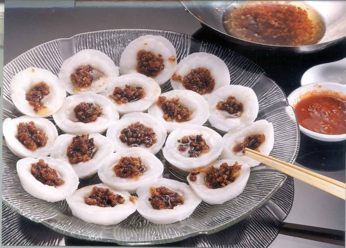 【咸水粿】是潮州传统粿食小吃。外观是一个由米浆做成的如同小碟子的粿皮,中间是盛放着热的菜脯干,色泽嫩白,口感润滑。粿皮无味但有嚼劲,配上菜脯干的香甜和芳咸。其历史悠久,味道可口。广受当地老百姓喜爱。