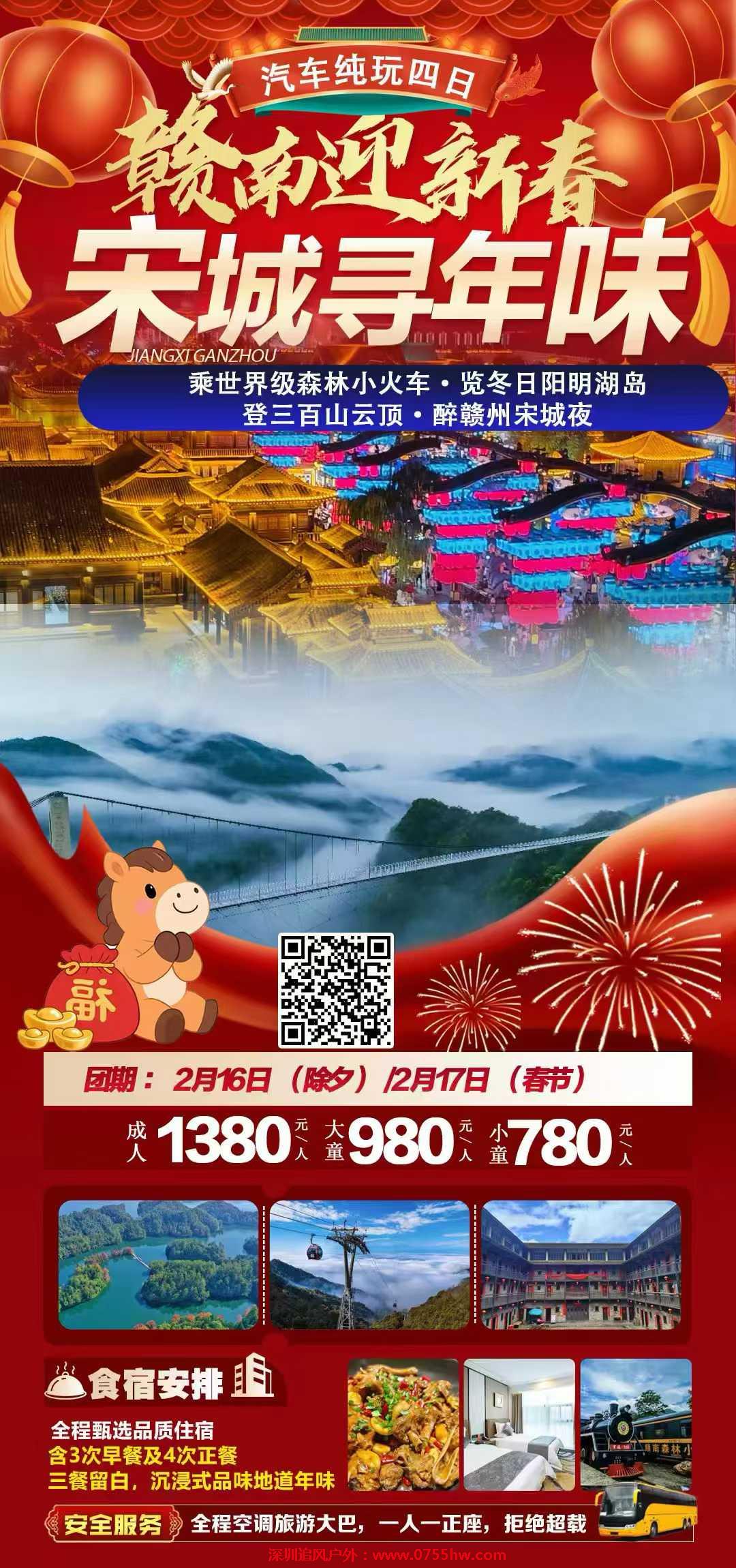 各位贵宾,我们将于指定时间地点集合出发,乘旅游大巴前往【赣州龙南】。作为客家文化的重要发源地和“江西南大门”,龙南地处江西省最南端,毗邻广东,共赴一场独具风情的赣南新春之旅。期待与您相伴,在浓郁的年味与客家文化中,迎接崭新春天。