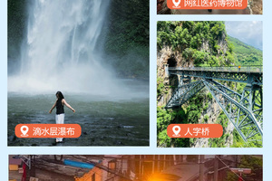 随后开车前往【屏边苗族自治县】,先抵达【滴水层瀑布】,到达观景台停车点后沿小路向下,穿过雨林、竹海到达瀑布,瀑布从头顶倾泻而下,巨大的水汽带来原始的压迫感,震撼人心。结束后,我们返程到【滴水苗城】,独特且统一的苗式建筑,让人一进入牛角寨门后就从视觉上体验到当地的苗族文化,这里山水相依,四季常青,水坝形成瀑布景观,是拍照打卡的绝佳地点。随后来到【网红医药博物馆】,博物馆位于滴水苗城高处,是苗族传统宫殿式风格,形成“层叠错落、飞檐翘角”的视觉效果,里面的活体或标本药材,如半人大的灵芝、开花的三七、切块的龙血树等,设计独特,令人印象深刻,可以了解到蚩尤带领九黎的故事及九黎迁入云南繁衍生息的历史。晚上入住屏边酒店休息。