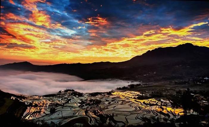 晚点前往【坝达梯田】拍摄日落。坝达景点是申报世界文化遗产核心保护之一、坝达梯田气势磅礴、面积广阔、立体感强、从海拔800米的麻栗村河起、依山而上、3700多级梯田棉不断、廷伸至海拔2000多米的高山。晚上入住元阳景区酒店。