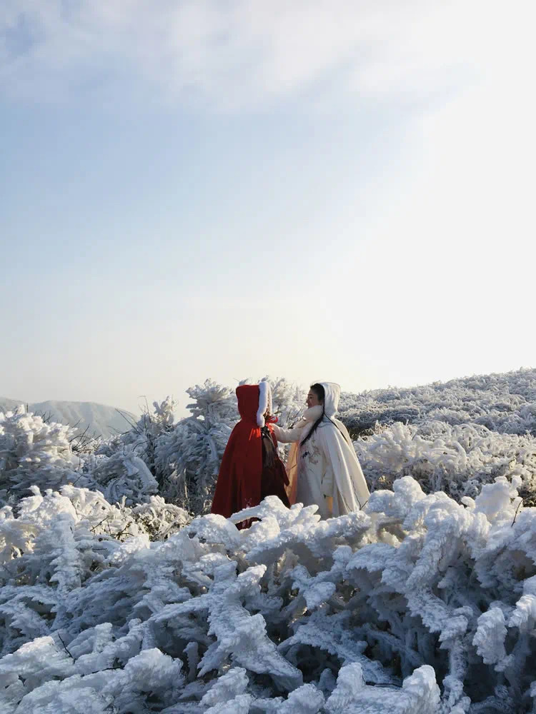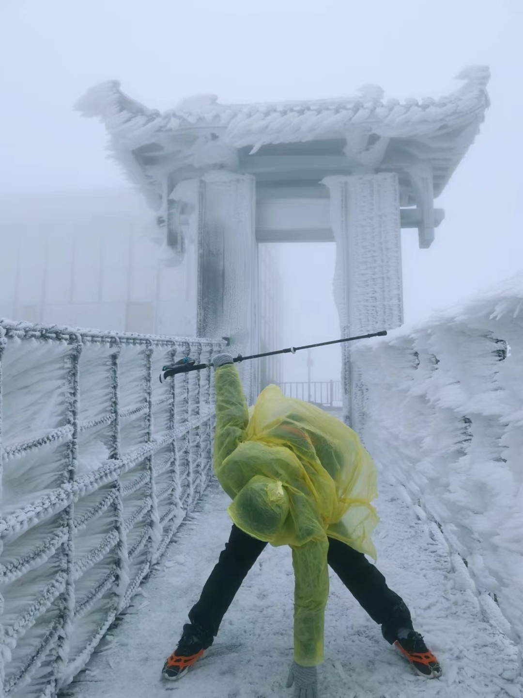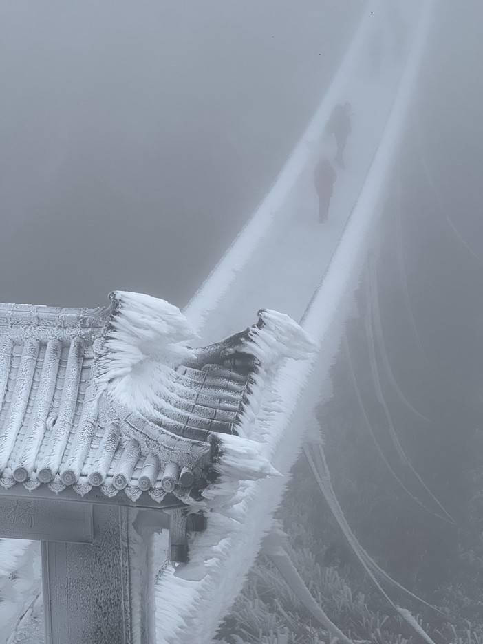 到了冬季,这里有南方难得一见、最吸引人的冰雪风景。随着天气降温,接连几天跌破冰点的气温让云冰山上的冰挂越积越厚,从半山腰一直到山顶,所有草木都披挂上一层冰霜,一派北国风光。