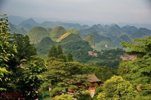 万山朝王外观---又称“八百罗汉”,计有石山1000余座,座座背朝东北,面朝西南,组成群山俯首,恭躬油岭“盘古王山”称臣的壮观画面。