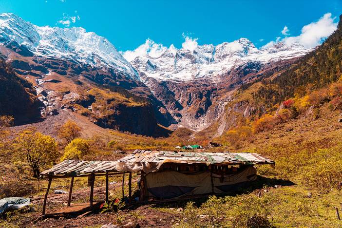 清晨用完早餐后, 从雨崩村出发,经高海拔原始森林及杜鹃丛林,徒步将近2小时后翻过海拔3900米的上那宗拉垭口,直至雨崩河底随后穿过一片原始松树林,约1小时后抵达海拔3600米的中日联合登山队“笑农大本营”。1991年由中日联合登山队修建而成,是登梅里雪山卡格博峰的一个大本营,去雨崩村旅游必去的一个地方,风景优美。