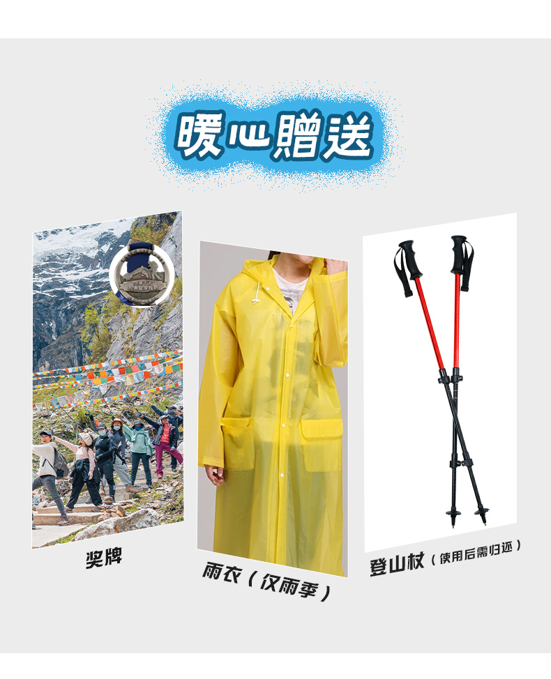 1、装备:每人饮用水1瓶、一次性雨衣1件(仅限雨季)、户外魔术头巾1条、登山杖2支(为了环保,我们鼓励领队回收登山杖,希望得到您的理解和支持);