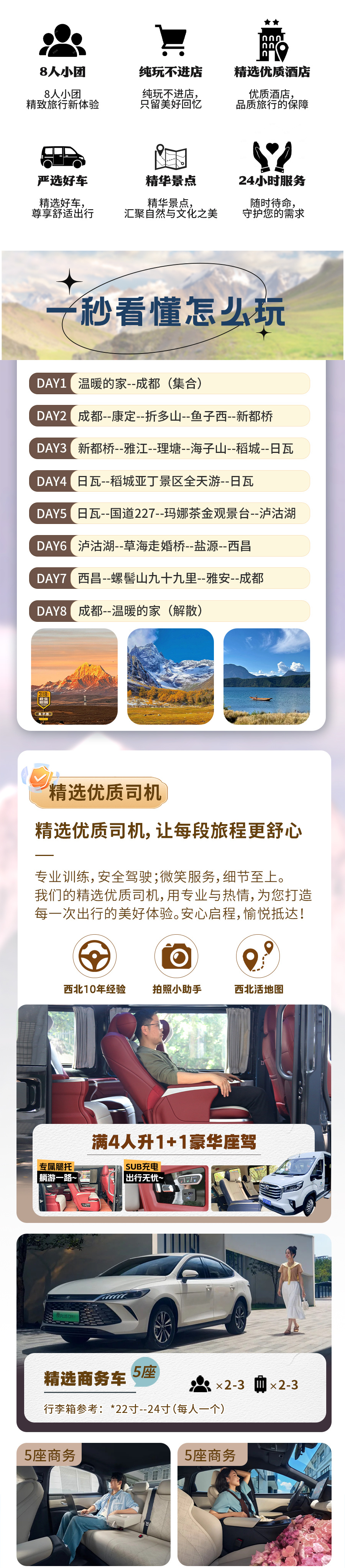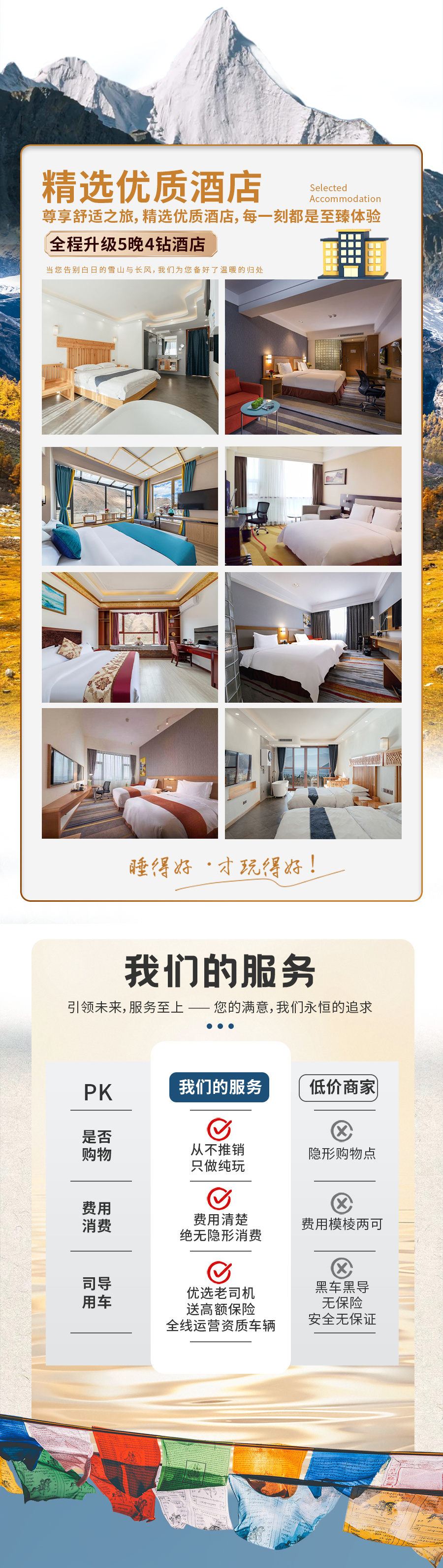 5.该线路部分目的地海拔较高,有严重高血压、心脏病等疾病的客人及老年客人,请根据自身条件,遵医嘱,谨慎决定是否出行。