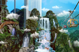 黄腾峡天门悬廊,2018 年开始,黄腾峡景区斥资 2.68 亿元,在峡谷的险峻山体上,倾力打造了集声、光、玻璃、水瀑于一体的超级玻璃桥廊项目——天门悬廊,目前成为广东省内唯一的玻璃悬廊。天门悬廊由三个钢混结构的巨型立柱支撑,外观如同双球拍交叉立于高山之上,直指云天,被广大游客形象的称为“大球拍”。