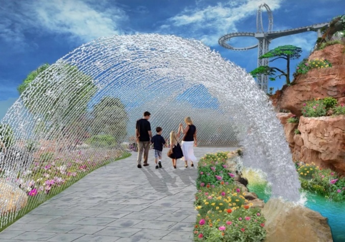 【花溪谷】位于天门悬廊之下长度达500余米,整体处于大峡谷半山腰由长度达268米的水拱长廊和长度近300米的梦幻灯光大道共同组成,沿溪还培育了各种奇花异草,不仅可以体验到浪漫的气息还能感受到夏日的清凉。